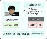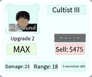 Cultist III is a 4-star ground and single target type unit based on a cultist from Magi: The Labyrinth of Magic anime. He can be obtained by earning him from any Story Mode mission in Magic City, evolving Cultist II, or by pulling him from the Gold Summon. He can evolve into Cultist IV using: