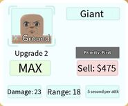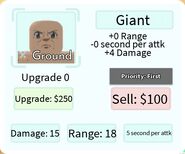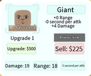 Giant is a 3-star ground and single target type unit based on a Titan from Attack on Titan. He can only be obtained from the Gold Summon or by earning him from an Outer Wall Story Mode mission. He applies bleed damage to enemies he attacks and takes up more placement space than most other units.