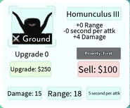 Homunculus III is a 4-star ground and single target type unit based on a Homunculus from Fullmetal Alchemist. He can be obtained by earning him from any Story Mode mission in Secret Lab, evolving Homunculus II, or by pulling him from the Gold Summon.
