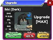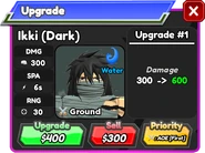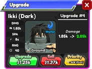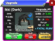 Upon receiving his last upgrade, Ikki (Dark) acquires the 'Awakening' ability. This power enhances his damage by 1,000,000, extends his range by 30, and modifies his AoE cone to be a bit narrower. Additionally, it transforms him into an air type unit and bestows the Blackflame effect. However, it restricts him from attacking ground enemies. The ability can be turned off to restore his original stats.