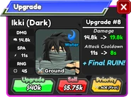 Ikki (Dark) is a 6-star ground and AoE (Cone) type unit based on Final Getsuga Tenshō Ichigo when he fights with Sosuke Aizen from Bleach . In an update on September 2, 2021, he was given a unit-exclusive Orb called the Dark Spiritual Orb, which gives him the ability to slow down all enemies on his final upgrade, along with the ability to hit air units. He can only be obtained by evolving Ikki (Hollow) .