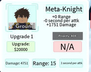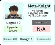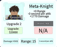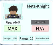 Meta-Knight is a 5-star ground and AoE (Full) type unit based on Suzaku Kururugi from Code Geass that can only be obtained from the Hero Summon and is not a part of any evolution. Only one Suzaku can be placed per player and he cannot be sold. He also has an ability that spawns a rideable mech when pressed. The player has to ride the mech by holding down the E key on PC, holding down on the card that appears above the mech on mobile, or the Y button on an Xbox controller. When inside the mech, the player can hit both air and ground units, as well as place, upgrade, or sell other units. While in the mech, the player is unable to go into first person without being blocked by the mech's parts. You have to be in Mech Form to attack.