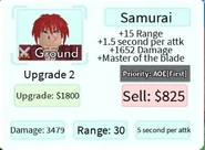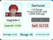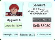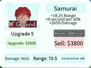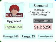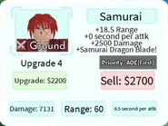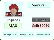 Samurai is a 5-star ground unit based on Himura Kenshin from the Rurouni Kenshin franchise. Samurai is obtainable by pulling him from the Hero Summon and is not a part of any evolution.