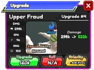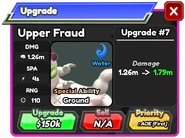 Upon activation, Upper Fraud places a trap made out of spikes on the track near him, damaging enemies who walk on it equal to their HP. If destroyed, the trap will inflict poison on the enemy, in total dealing x7 the trap's remaining damage. The spikes are always level 1 and do not gain HP with Upper Fraud's Level. Multiple spikes may be placed on one spot, and spikes can be placed in different areas by controlling Upper Fraud, walking to another path and activating his ability there. This ability has a cooldown of 90 seconds, and the traps despawn after 450 seconds.