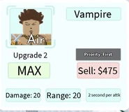 Vampire is a 3-star hill and single target type unit based on a vampire from JoJo's Bizarre Adventure. He can be obtained from the Gold Summon or by winning any Story Mode mission in Vampire Hideout.